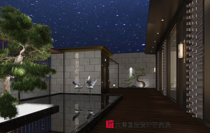 進(jìn)入門廳區(qū)域,映入眼簾的是一副仙鶴水戲圖,看著他們在水中浮沉游戲,仿佛時間靜止,物我兩忘。旁邊旋轉(zhuǎn)而上的青銅質(zhì)感的迎客松,是整個空間一大亮點。兩側(cè)是吧臺與卡座分廳而立。水景屏風(fēng)后方是通透簡明的明檔,模糊了明檔與公共區(qū)域的邊界。