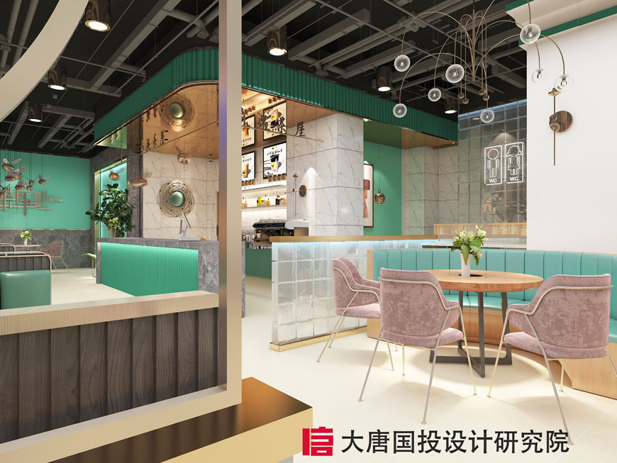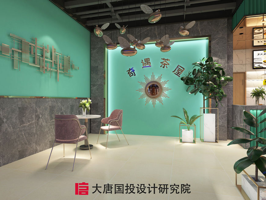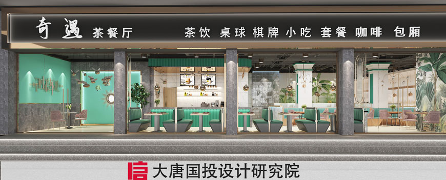 奇遇茶餐廳設計的入口由大理石紋路的瓷磚和綠色墻面構成,創(chuàng)建出一個舒緩的流線設計,引導著顧客緩慢進入這個愜意的空間。